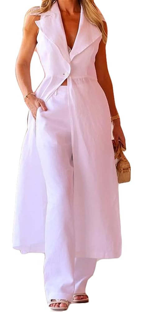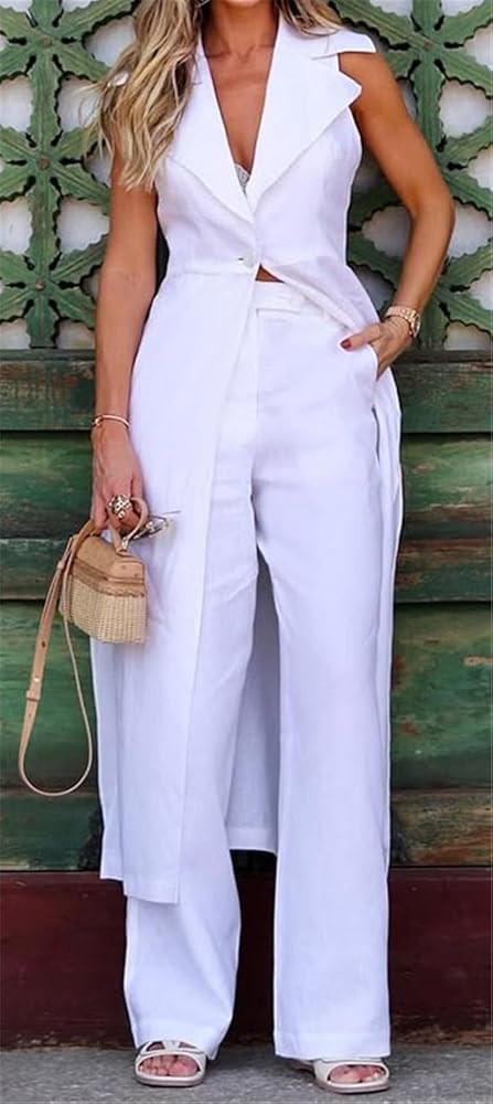 Women’s 2-Piece White Sleeveless Long Vest & Wide-Leg Pants Set