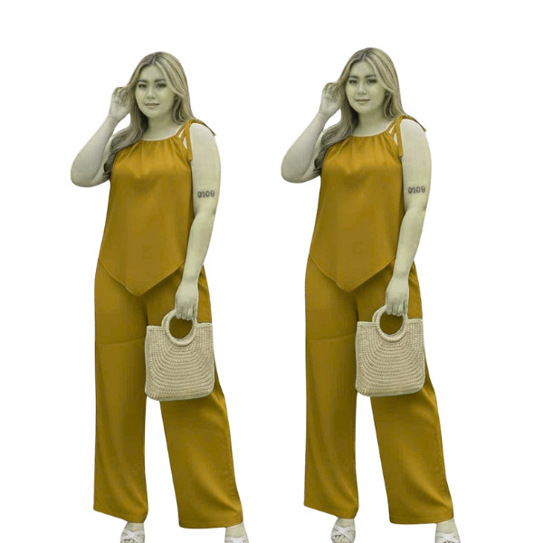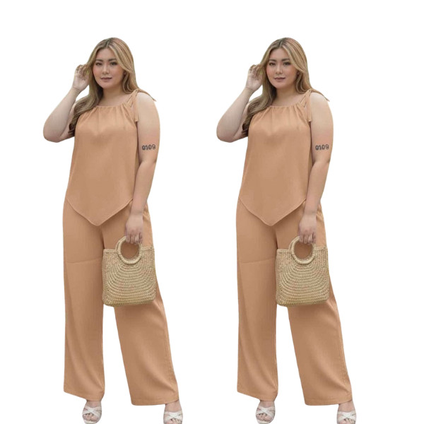 Upgrade your wardrobe with this stylish and comfortable plus-size two-piece set. Designed with a sleeveless top featuring tie straps and wide-leg pants, this outfit is perfect for casual outings, travel, or everyday wear. Made with breathable fabric to ensure both comfort and elegance.
